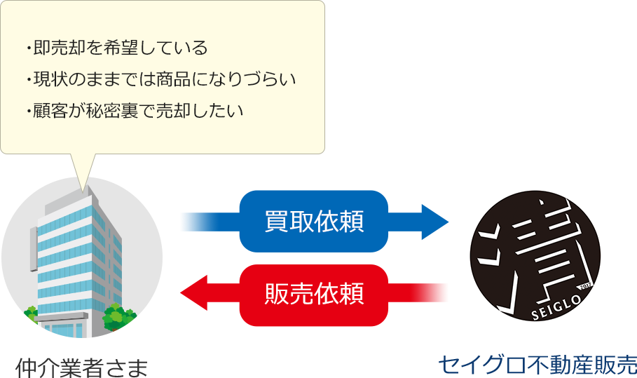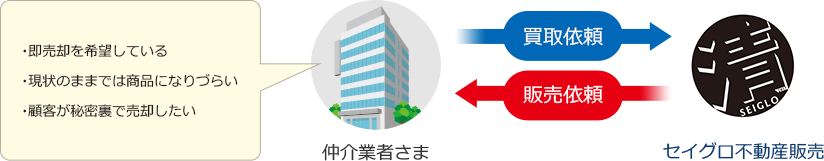 セイグロ不動産販売は買取りビジネスを不動産仲介会社との共同事業と考えています。