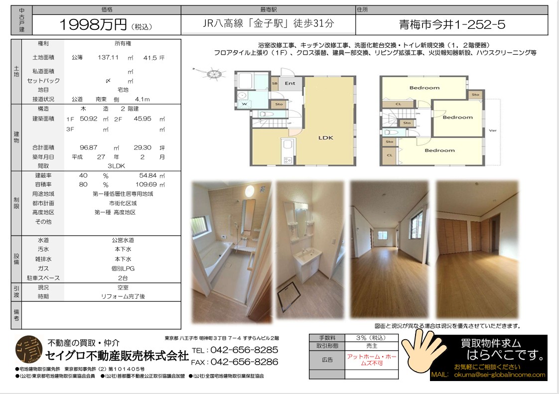 青梅市今井2088万円中古戸建の価格を1998万円に変更しました。